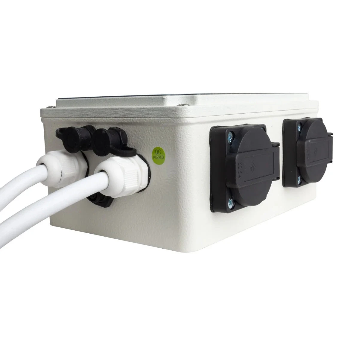 The Enviro4 controller manages fans and offers four programmable sockets for controlling heaters, humidifiers, dehumidifiers, and lights in your grow room. It supports customized day and night settings for heaters, humidifiers, and dehumidifiers. The controller accommodates most equipment within a limit of 2,200 watts per exit. For grow lights, avoid exceeding 2,400 watts across all four plugs due to high start-up surges.