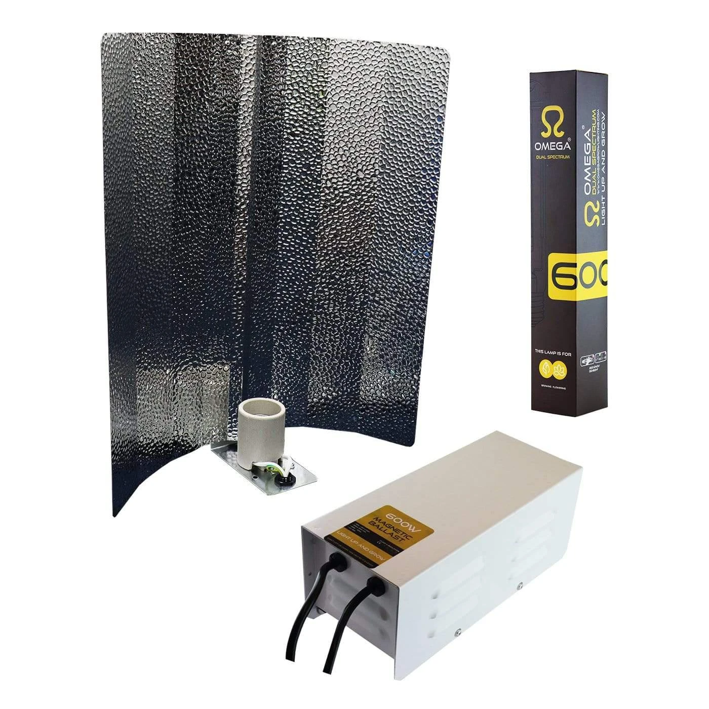 The Omega 600W Magnetic HPS light kit is supplied with a 600W Magnetic metal vented ballast, 600W Omega Dual Spectrum HPS lamp, & a Euro Reflector with a 5m lead.